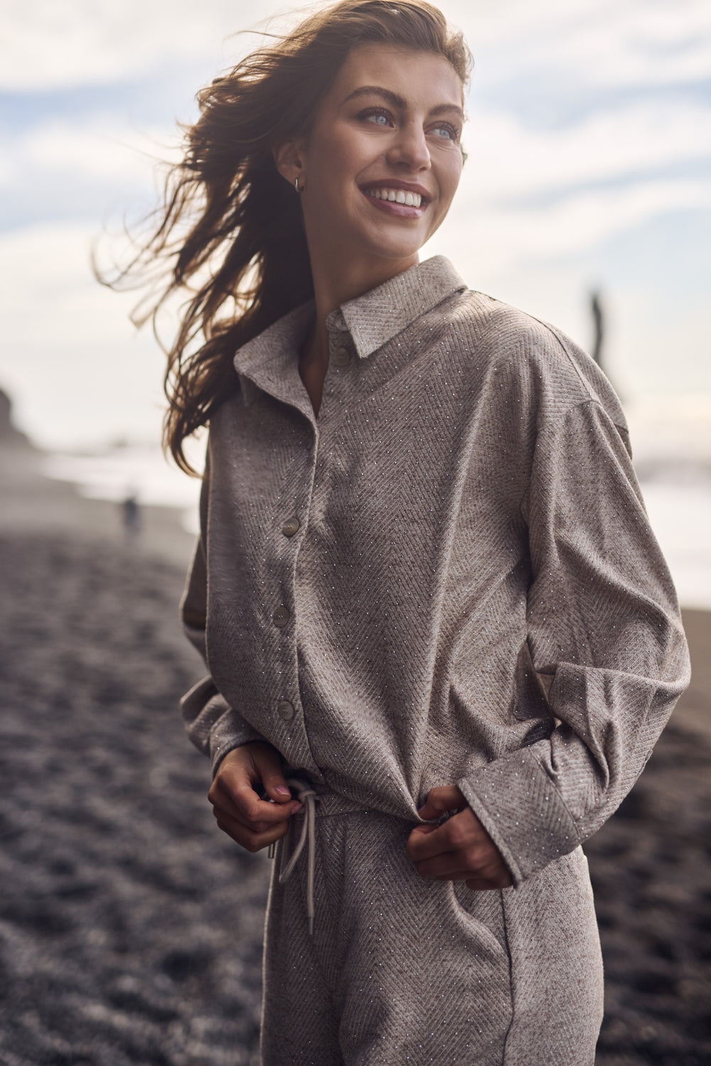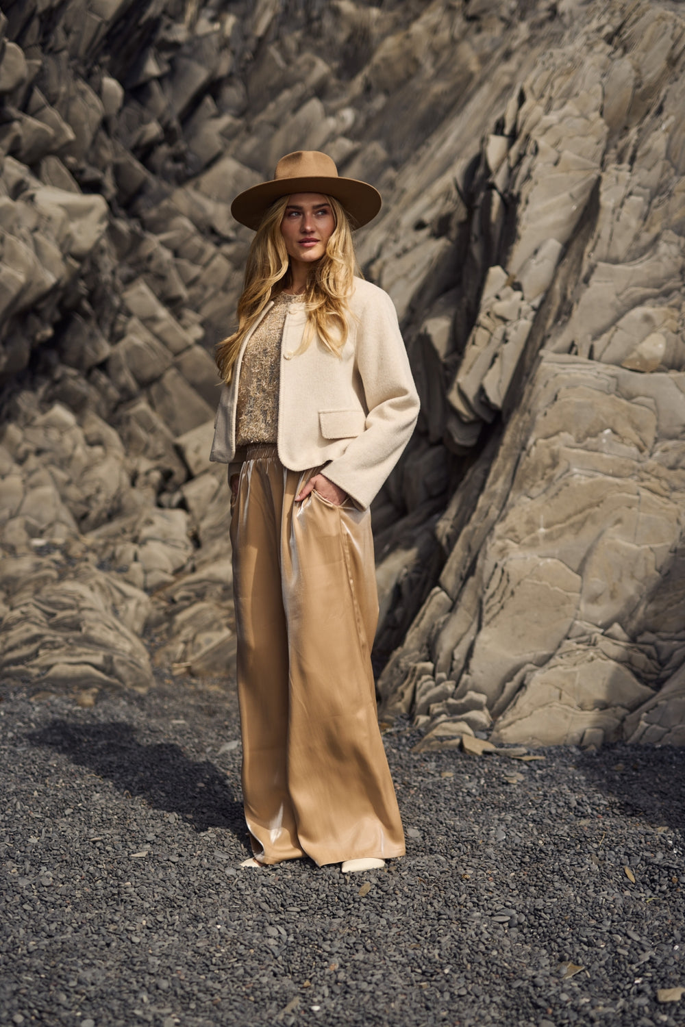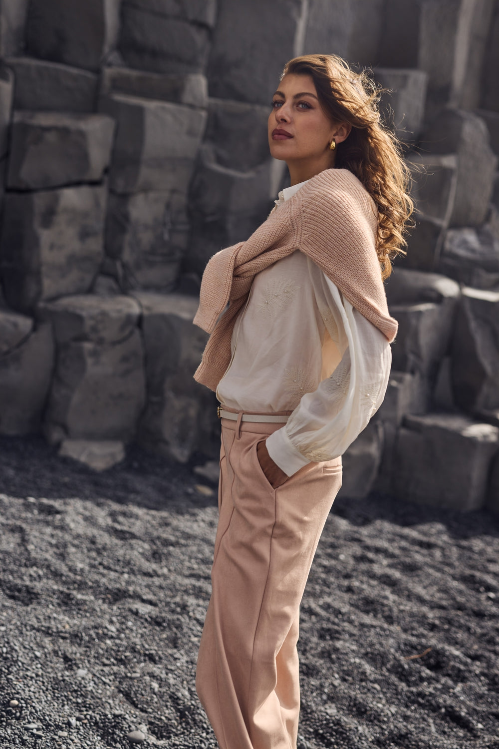 Het zachtroze steekt heel mooi af bij de grijze rotsige omgeving en zwarte strand, donkere kleuren die straks in volgende leveringen terugkomen. Natuurlijk zijn er ook weer rustige naturellen (zand, beige, offwhite), die perfect passen bij de zachtroze tinten. Kleuren die je het hele seizoen kunt dragen.
